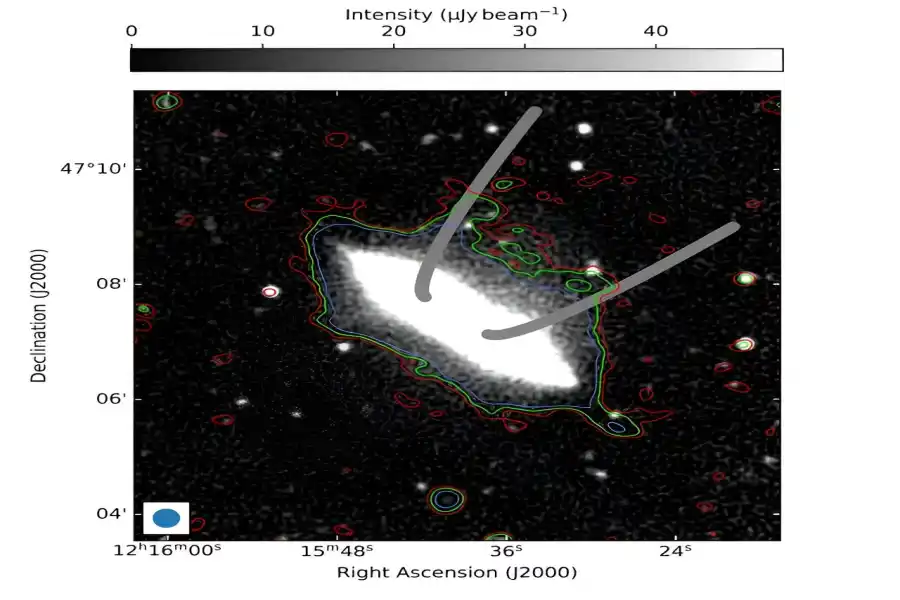 Valtava radiokupla, jonka halkaisija on 65 000 valovuotta, ympäröi tätä lähellä olevaa galaksia.
